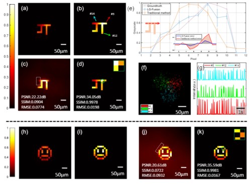 介质折射率的不均匀性会导致光子传播方向扰乱,从而引起严重的图像退化。基于弹道光的散射成像技术受限于成像深度,而利用散射光的成像技术通常需要大量的迭代和测量,或受限于成像视场。近年来发展出一种基于非负矩阵分解(NMF)的散射成像方法,可在无介质先验的情况下实现透过散射层的大视场非侵入成像。该方法利用非负矩阵分解特征解混特性,实现从强度叠加散斑中提取指纹。基于指纹解卷积实现逐点定位,并将视场扩展至超记忆效应范围。然而,该方法需大量数据,缺乏固有灰度,且易产生伪影和背景噪声。