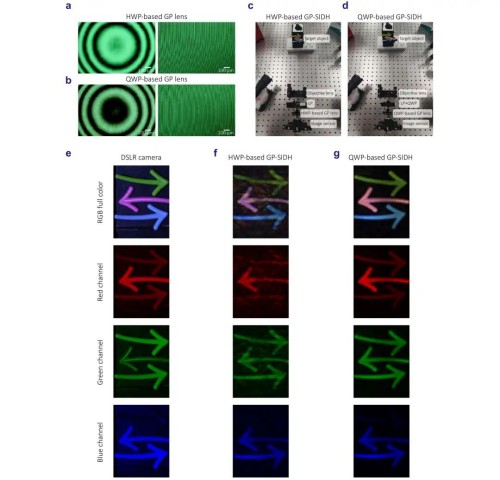 图5:基于半波片(HWP)和四分之一波片(QWP)的GP透镜的GP-SIDH系统的实验表征和全彩全息重建结果