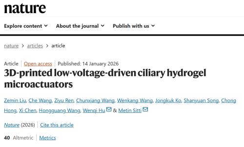 研究成果于 2026 年 1 月 14 日以题为“3D-printed low-voltage-driven ciliary hydrogel microactuators”发表在《Nature》上。