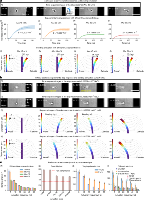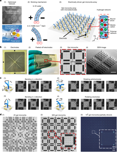 马克斯·普朗克智能系统研究所 Metin Sitti、Wenqi Hu 团队展示了一种此前未被发现的微米级水凝胶的快速电响应,该响应可在低至 1.5 V 的电压下诱导产生,且无需水解。这种弯曲运动是由离子在纳米级水凝胶网络中的迁移驱动的,该网络采用双光子聚合技术进行 3D 打印,且可在毫秒内完成。基于这些发现,作者打印了一种由柔软的丙烯酸-丙烯酰胺共聚 (AAc-co-AAm) 水凝胶(模量约为 1000 Pa)构成的凝胶微纤毛阵列,该阵列可在毫秒内响应电刺激。每个微纤毛的直径为 2–10 µm,高度为 18–90 µm,可实现高达 40 Hz 的三维旋转弯曲运动,模拟了天然纤毛的几何形状和动力学特性。这些凝胶微纤毛在连续 33 万次驱动循环后仍能保持功能,性能衰减小于 30%。这种凝胶微纤毛阵列可以集成在柔性聚酰亚胺基底上,并可利用传统光刻技术进行大规模制造。它们还可以通过微电极阵列实现独立的动态控制,并可在微米尺度上实现流体操控和颗粒输送。