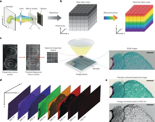 浙江大学 Jianrong Qiu (邱建荣)、Zhuo Wang (王卓)、Bo Zhang (张博) 团队证明了在聚碳酸酯基底中超快激光诱导产生的微涡旋可以在微尺度上生成复杂的色散信号。该方法基于光弹效应,能够提供丰富多样的光谱响应,从而实现高效采样。这种色散结构的工作带宽宽广(400–1550 nm),尺寸紧凑(10 × 10 µm²),且不受视角影响。该方法也适用于不同的热塑性聚合物,并具有良好的耐候性。作者证明,这种微涡旋结构可以与图像传感器集成,用于片上光谱分析和高分辨率显微光谱成像。