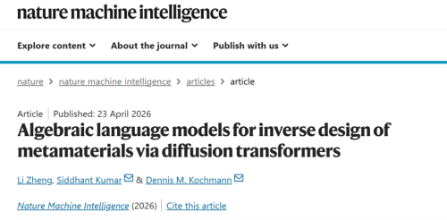 研究成果于 2026 年 4 月 21 日以 “Algebraic language models for inverse design of metamaterials via diffusion transformers” 为题发表于《Nature Machine Intelligence》。