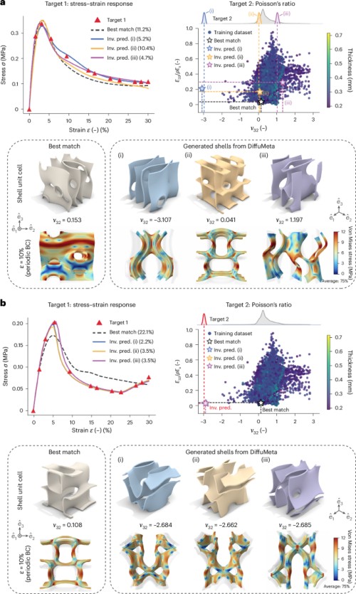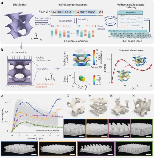 苏黎世联邦理工学院 Dennis M. Kochmann 团队和代尔夫特理工大学 Siddhant Kumar 团队提出了一种名为DiffuMeta的生成框架,该框架将扩散变换器与代数语言表示相结合,将三维几何体编码为数学语句。这种紧凑统一的参数化方法涵盖了多种拓扑结构,使得变换器能够直接应用于结构设计。DiffuMeta利用扩散模型生成具有精确应力-应变响应的新型壳体结构,在大变形下,它考虑了屈曲和接触,并通过生成多样化的解决方案来解决固有的一对多映射问题。作者的方法独具特色,能够同时控制多个力学目标,包括训练域之外的线性和非线性响应。对已制造结构的实验验证进一步证实了作者的方法在加速设计具有定制特性的超材料和结构方面的有效性。