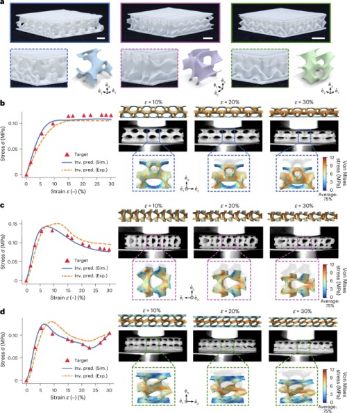 图4:具有未见应力-应变响应的逆向设计壳体超材料
